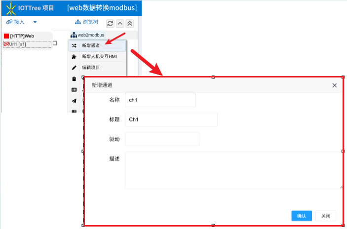 鼠标右键浏览树的根节点选择"新增通道"。填写如下:
