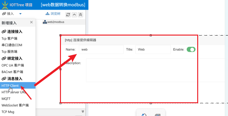 在左上角点击"接入",选择"HTTP Client",填写对话框 Name=web ,Title=Web。如下: