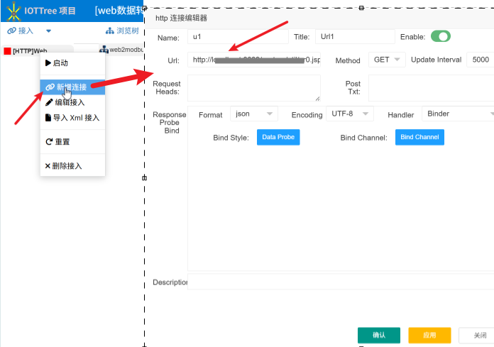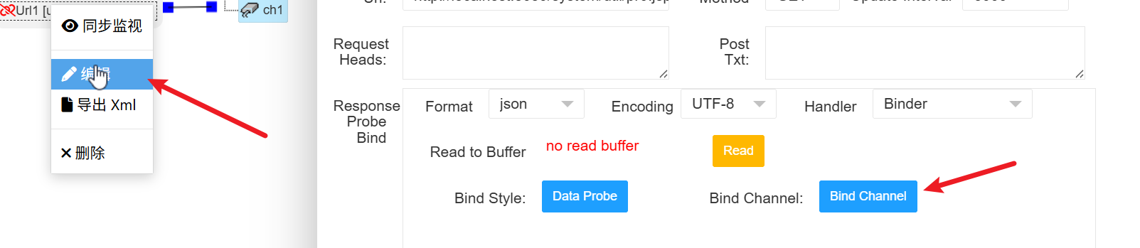 再次鼠标右键接入"Url1 [u1]",选择编辑,在弹出对话框中点击按钮"Bind Channel"。