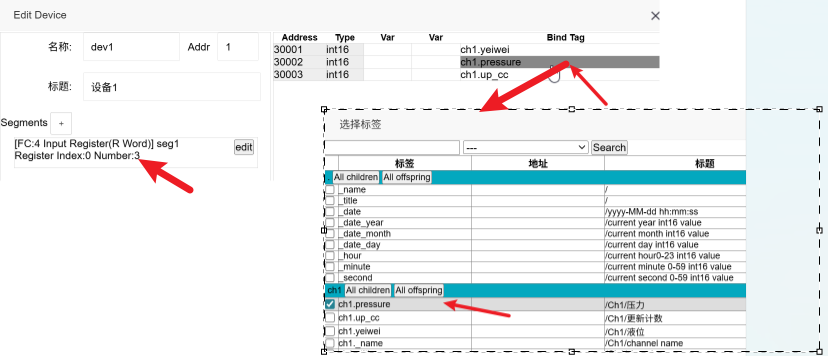 确定之后,点击选择此段,右边会出现3个数据地址列表,我们只需要把Bind Tag列选择添加对应的标签进行绑定即可: