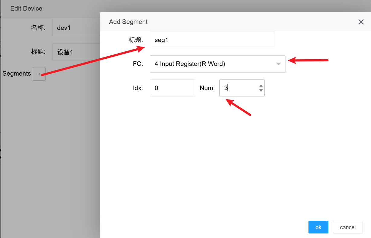 我们点击段添加或现有段编辑按钮,弹出的编辑界面填写如下: