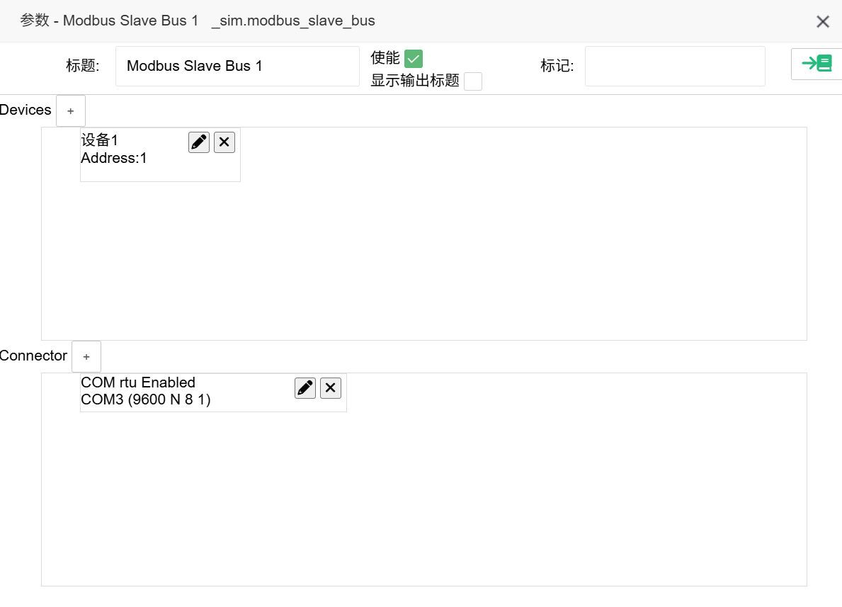 一个Modbus Slave节点代表了一个Modbus 总线,上面可以配置一个或多个Modbus设备(每个设备地址不相同)。因此,在节点弹出的配置界面中,上面部分是设备区域(Devices),你可以在其中添加多个设备。