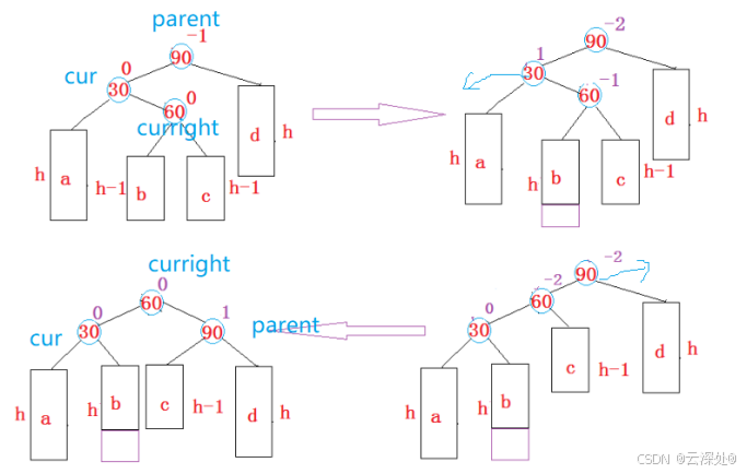 - 更新后parent的平衡因子为+(-)2,parent树的高度变化且不平衡,需要对该树旋转