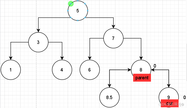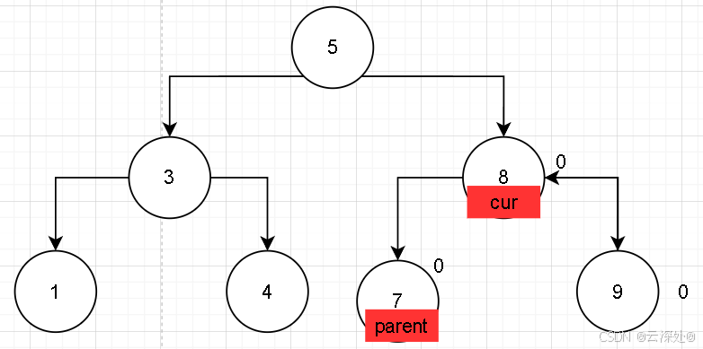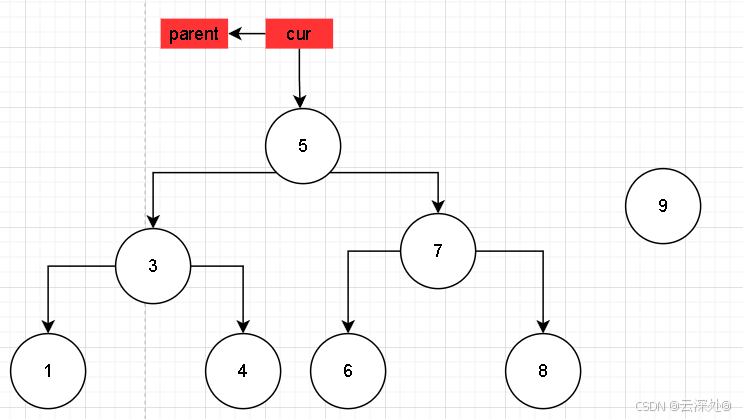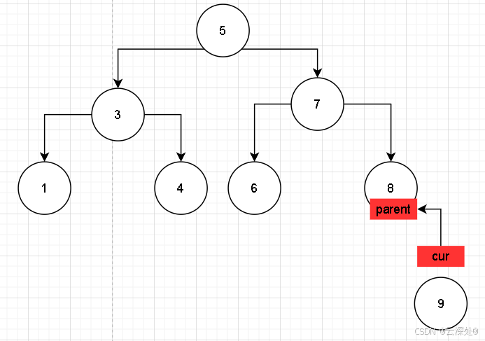 当插入9时,cur记录当前节点,parent记录父节点,便于建立双向链接