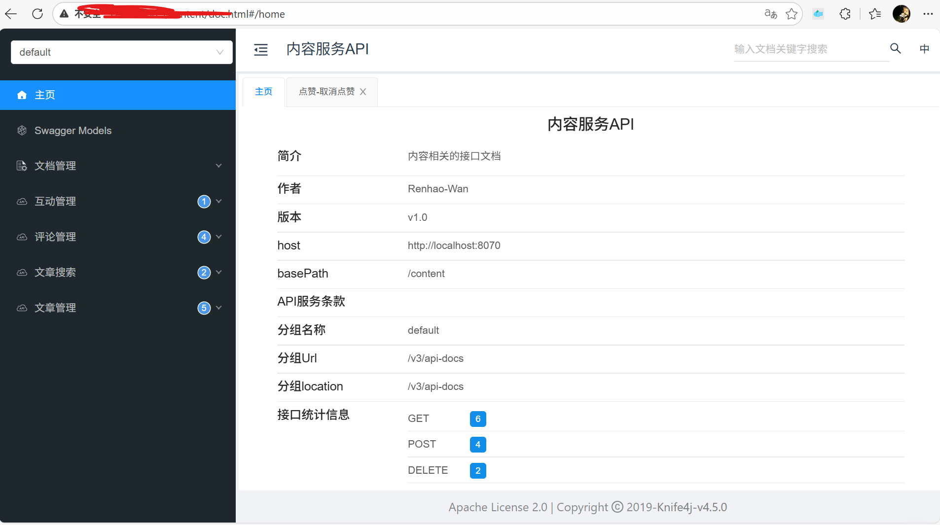 接口调试:点击任意一个服务,Nginx 会根据 Referer 自动转发,展示 Knife4j 文档。你可以直接在页面上进行接口测试(例如登录、发帖)。