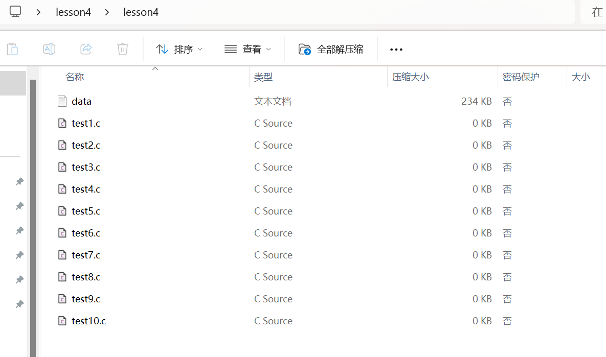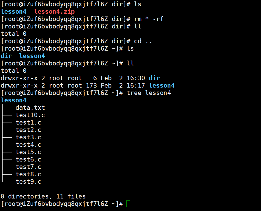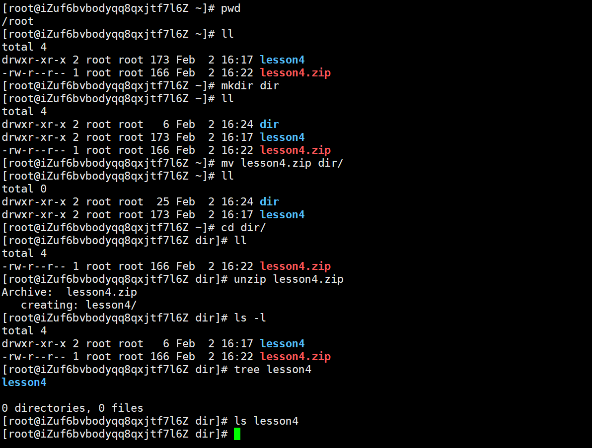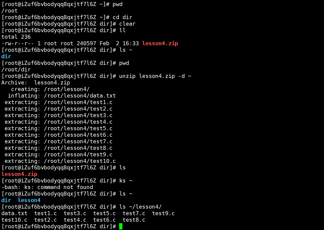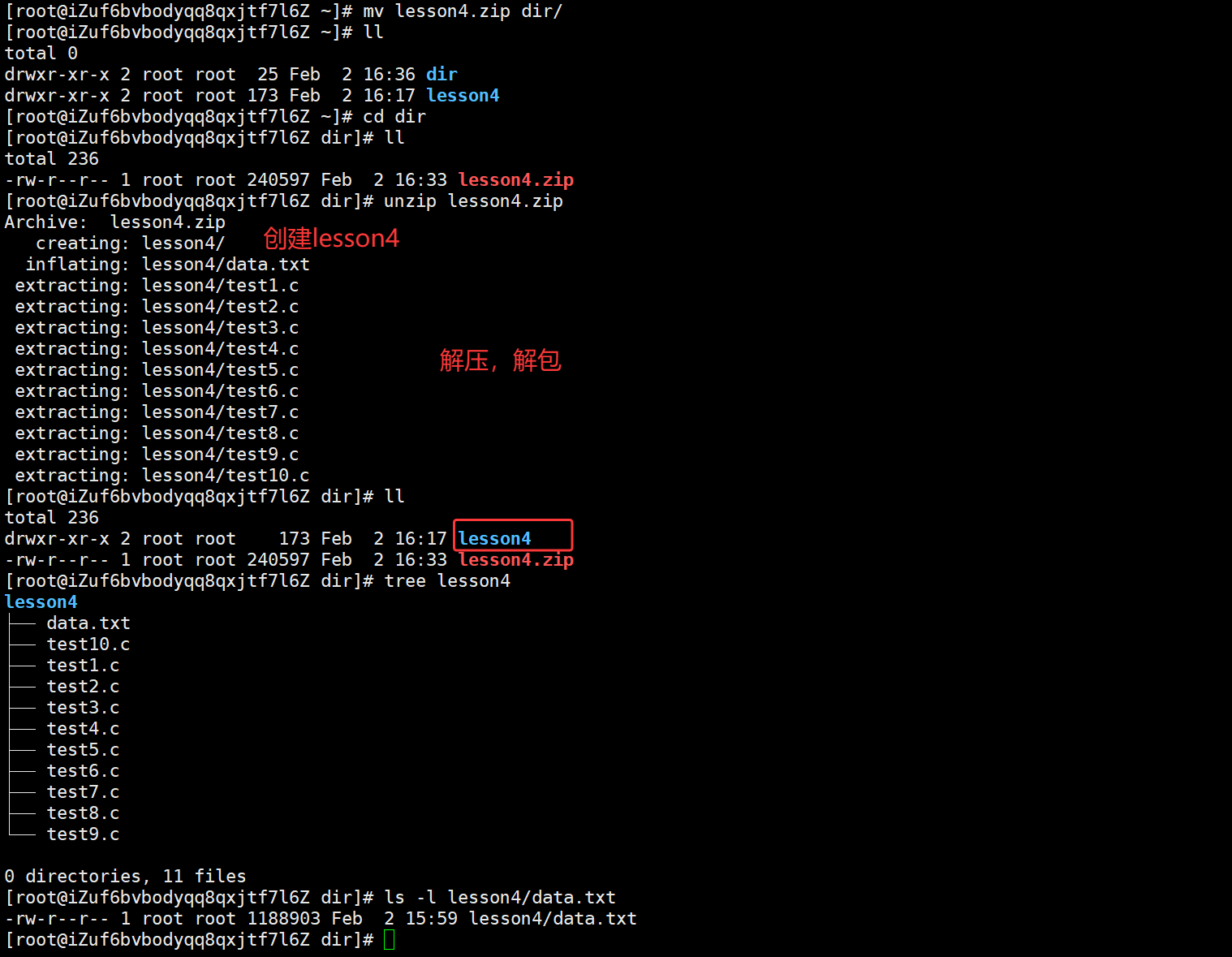 图中解压的指令是upzip lesson4.zip。默认解压到当前路径