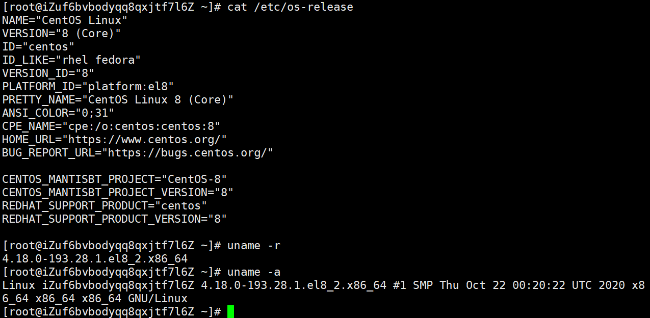 以图中Linux iZuf6bvbodyqq8qxjftf7l6Z 4.18.0-193.28.1.el8_2.x86_64 #1 SMP Thu Oct 22 00:20:22 UTC 2020 x86_64 x86_64 x86_64 GNU/Linux为例