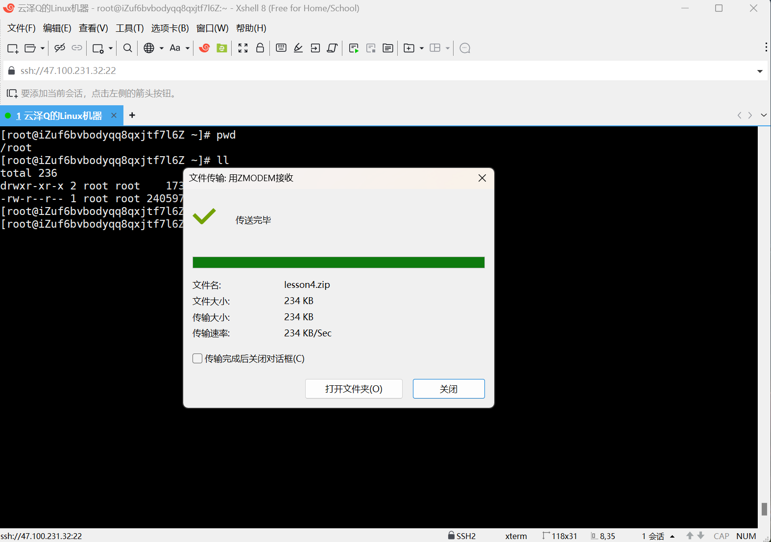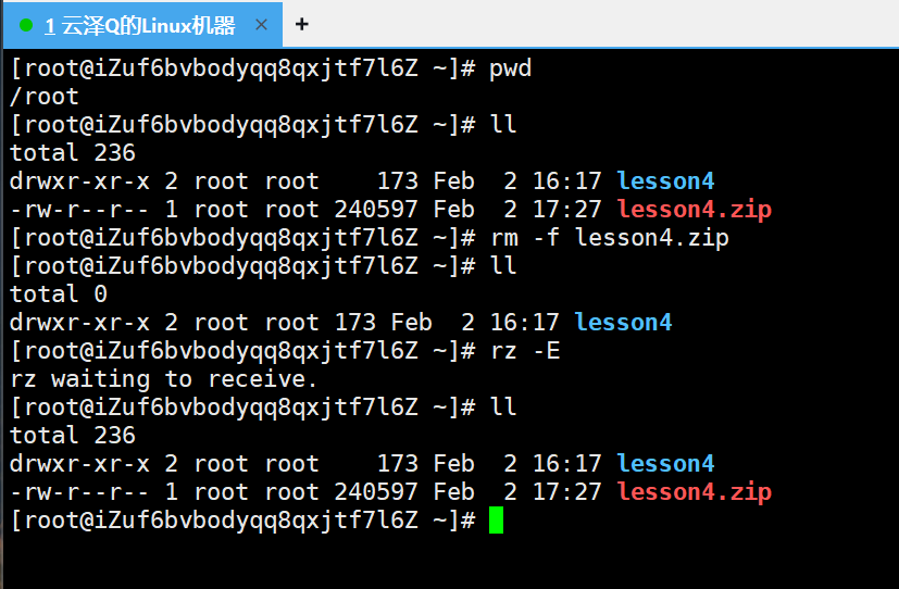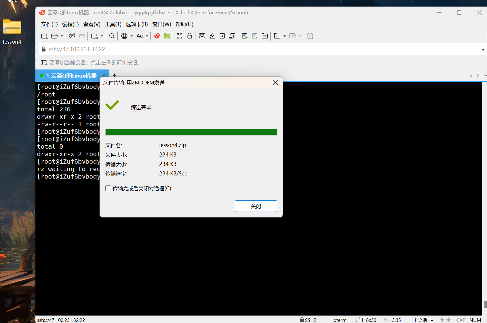 这就要借助一个指令 sz lesson4.zip(可以理解为send的意思),