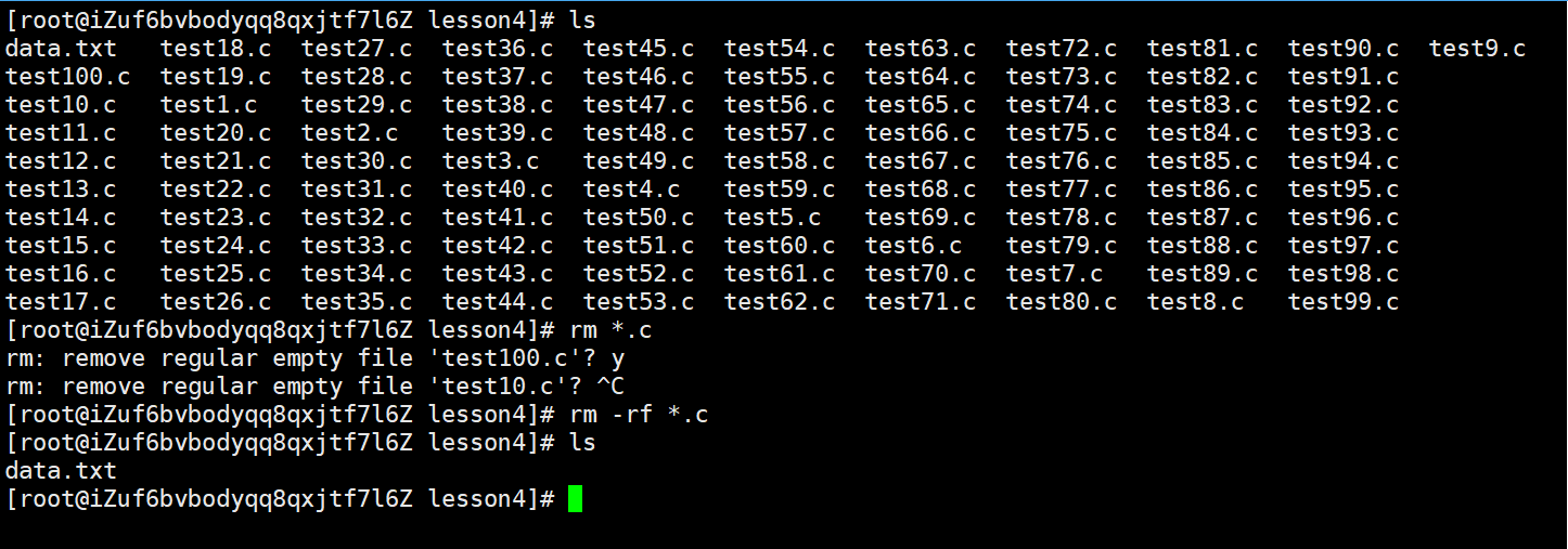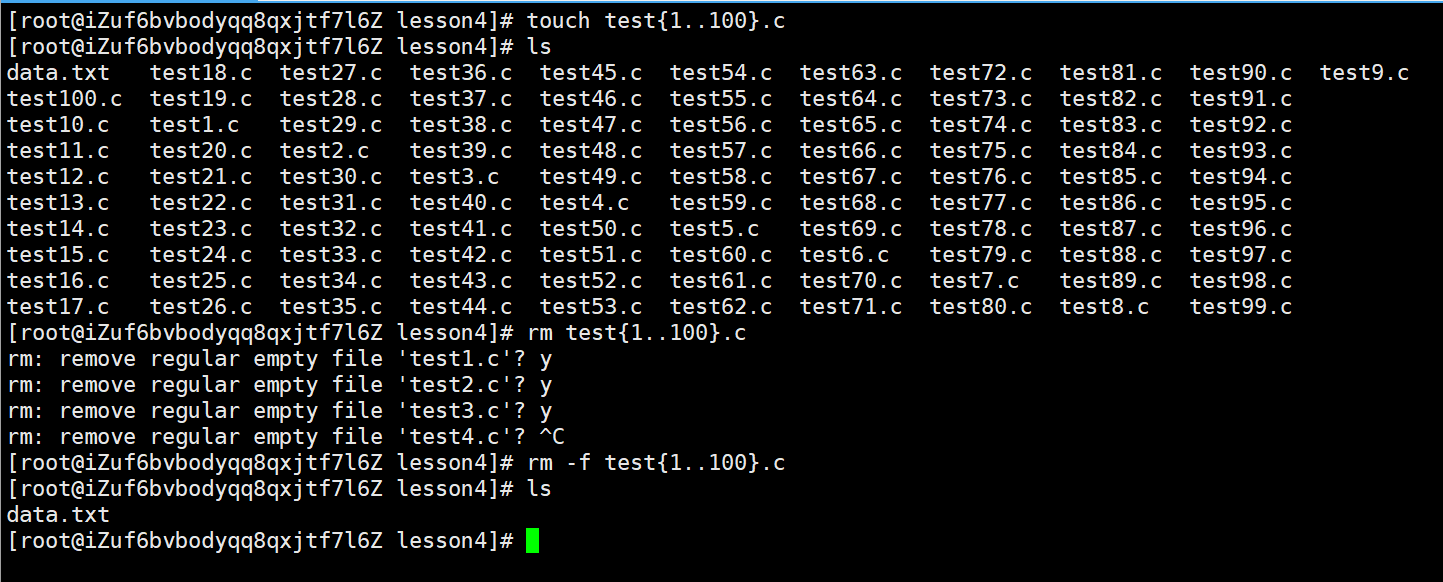 使用rm test{1..100}.c会每次询问,使用rm -f test{1..100}.c可以不经询问,直接删除,还可以使用通配符*删除