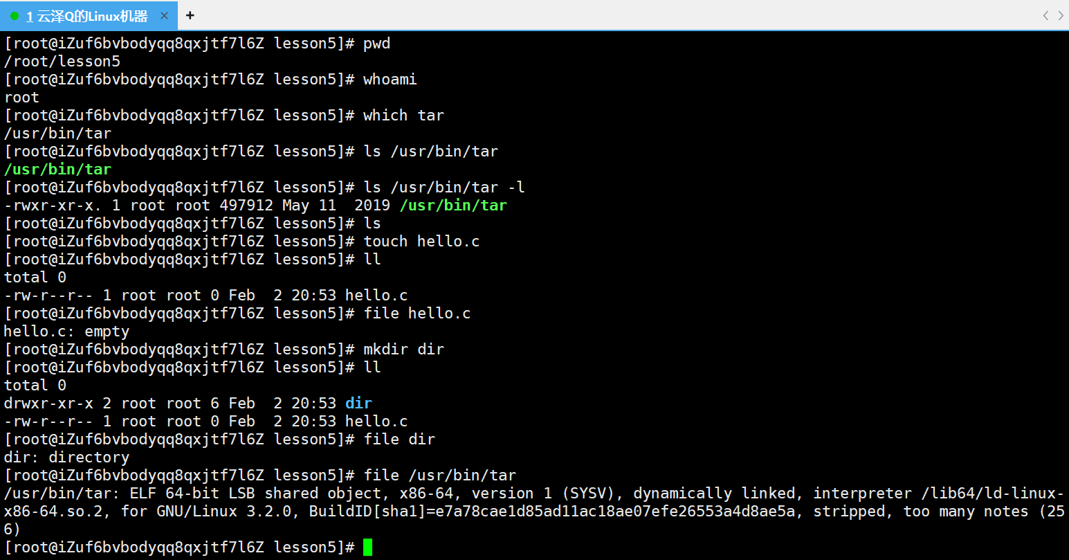 可以看到tar是一个X86 - 64位下的可执行程序(executable),也就是说该指令就是用C写的二进制可执行程序,我们平时自己编译形成的二进制程序用file命令查也是一个可执行程序,后面的一些信息在后续文章中都会顺带介绍