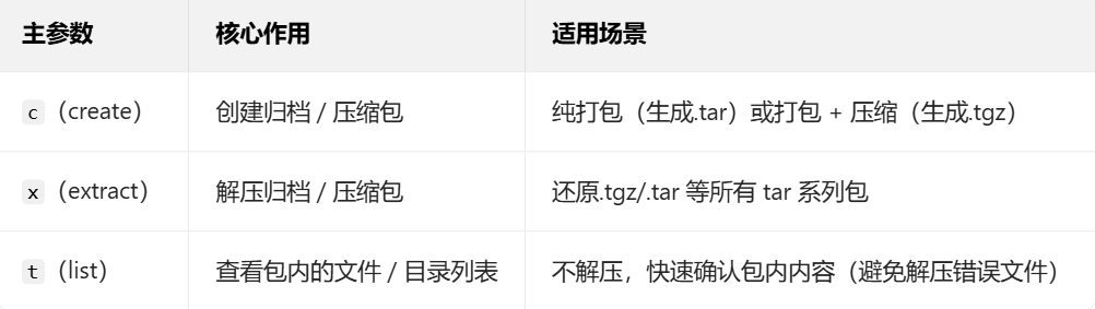 tar 参数分必选主参数 (定义核心动作,三选一)和可选辅助参数(按需组合),语法格式: