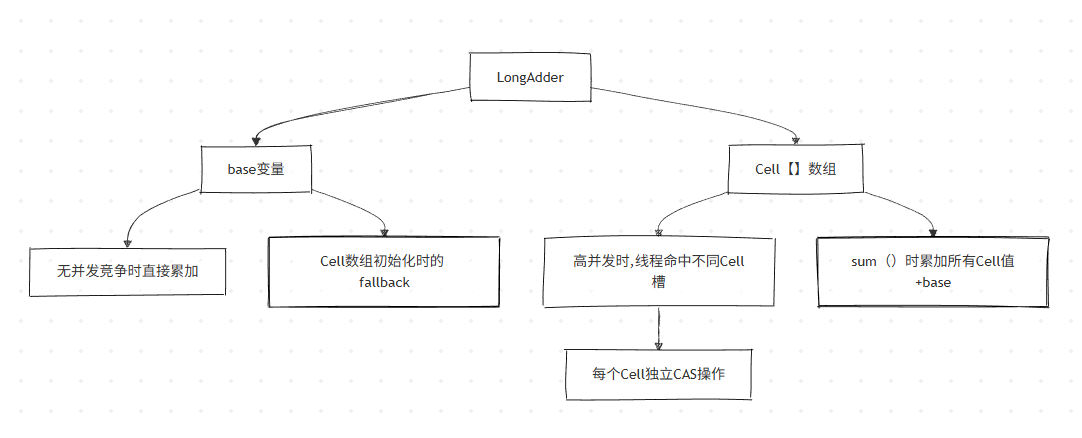 base:无竞争时的累加基数Cell[]:竞争时的分散存储数组(大小为 2 的幂,与 CPU 核数相关)cellsBusy:自旋锁,用于 Cell 数组的初始化和扩容
