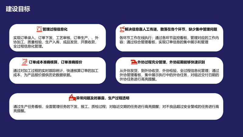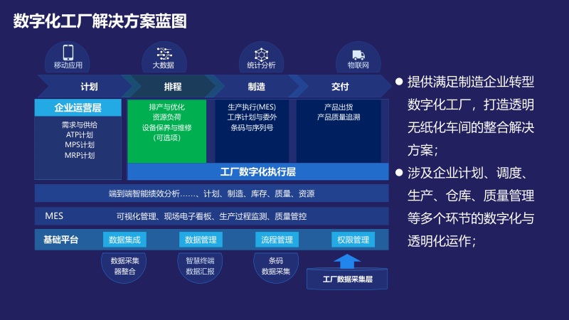 - 涉及环节:计划、调度、生产、仓库、质量管理等