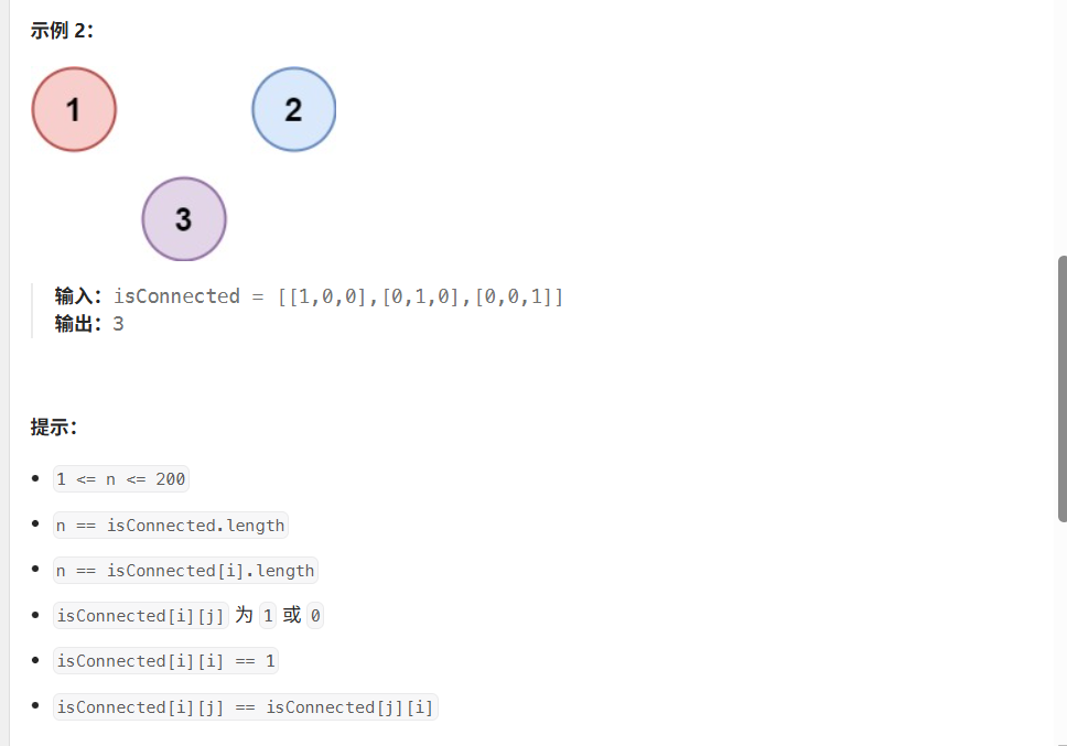 n × n的邻接矩阵isConnected,其中:isConnected[i][j] == 1表示城市i和城市j直接相连- 相连具有传递性 :