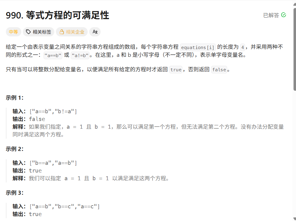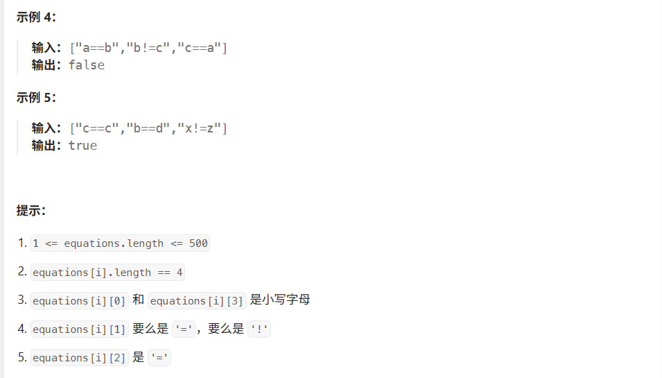equations[i]的长度为4,并采用两种不同的形式之一:"a==b"或"a!=b"。在这里,a 和 b 是小写字母(不一定不同),表示单字母变量名。只有当可以将整数分配给变量名,以便满足所有给定的方程时才返回
