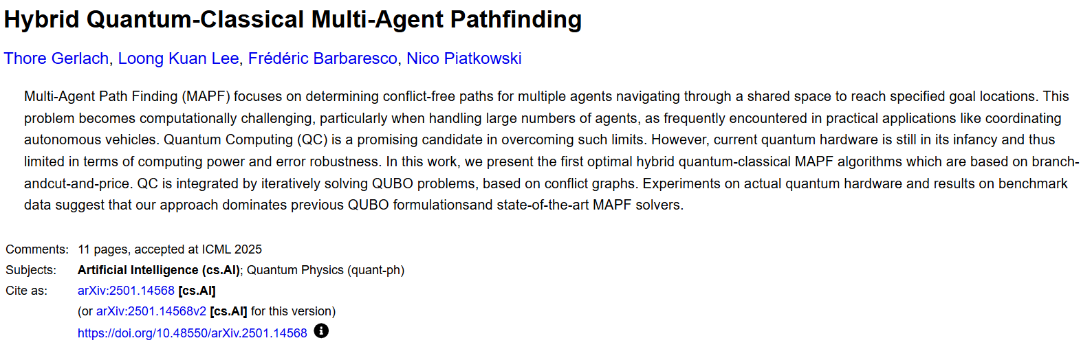 在城市无人机配送、仓库机器人协同、自动驾驶编队等场景中,多智能体路径规划(MAPF)是核心技术 ------ 需要为数十甚至数百个智能体规划无碰撞路径,同时最小化总行程成本。但随着智能体数量增加,这个问题会变成 NP 难问题,传统算法要么陷入 "算力爆炸",要么只能给出次优解。来自波恩大学与弗劳恩霍夫研究所的团队提出混合量子 - 经典 MAPF 算法,将路径规划转化为量子可解的 QUBO 问题,结合分支 - 切割 - 定价框架,在真实量子硬件上实现了对传统算法的超越,为大规模多智能体协同打开了新思路。