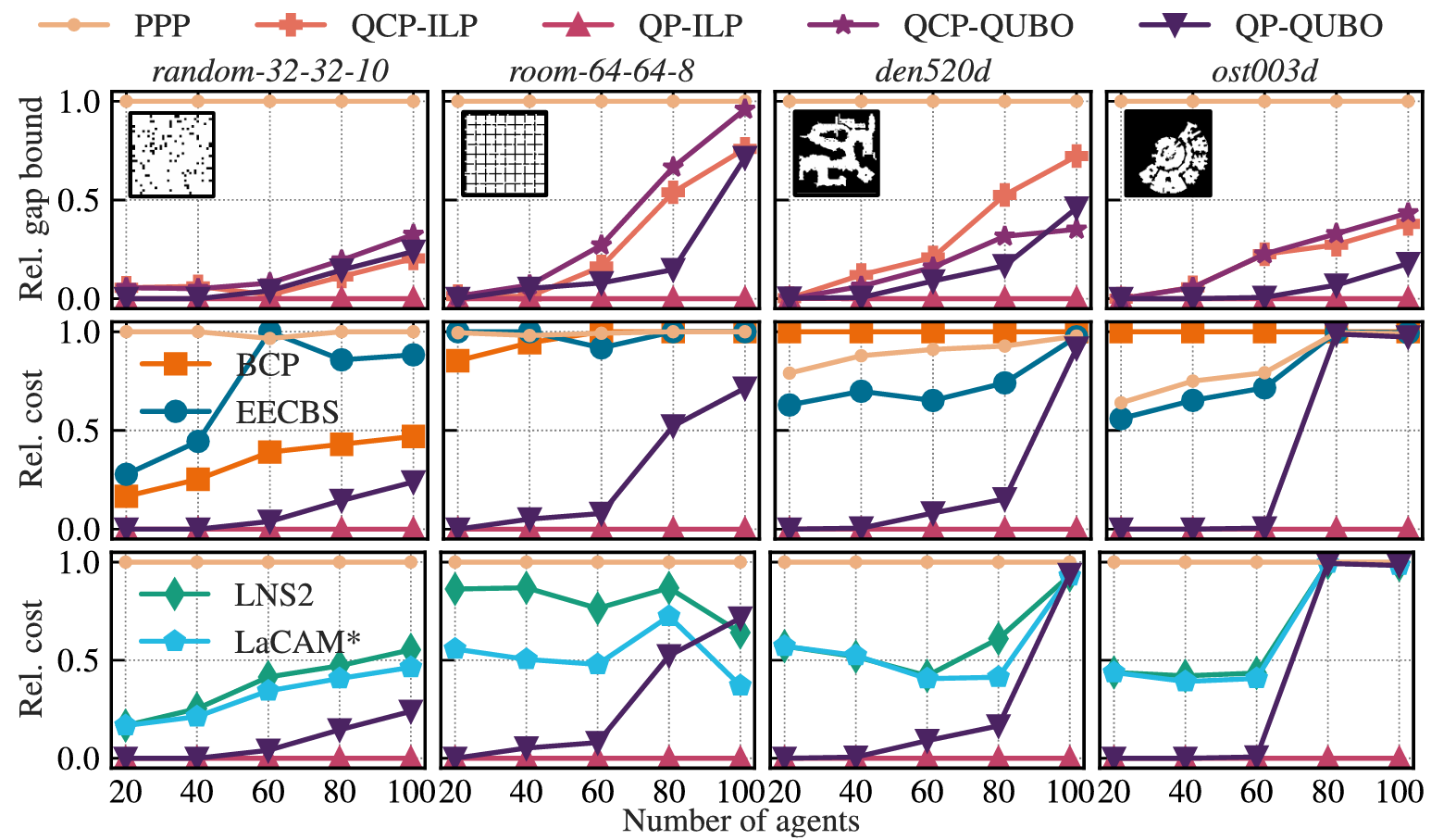 量子求解有效:基于量子退火器的 QUBO 求解版本(QP-QUBO),在多数场景中性能超越 LNS2 和 LaCAM*,部分地图(如 den312d)的路径成本甚至接近最优解;