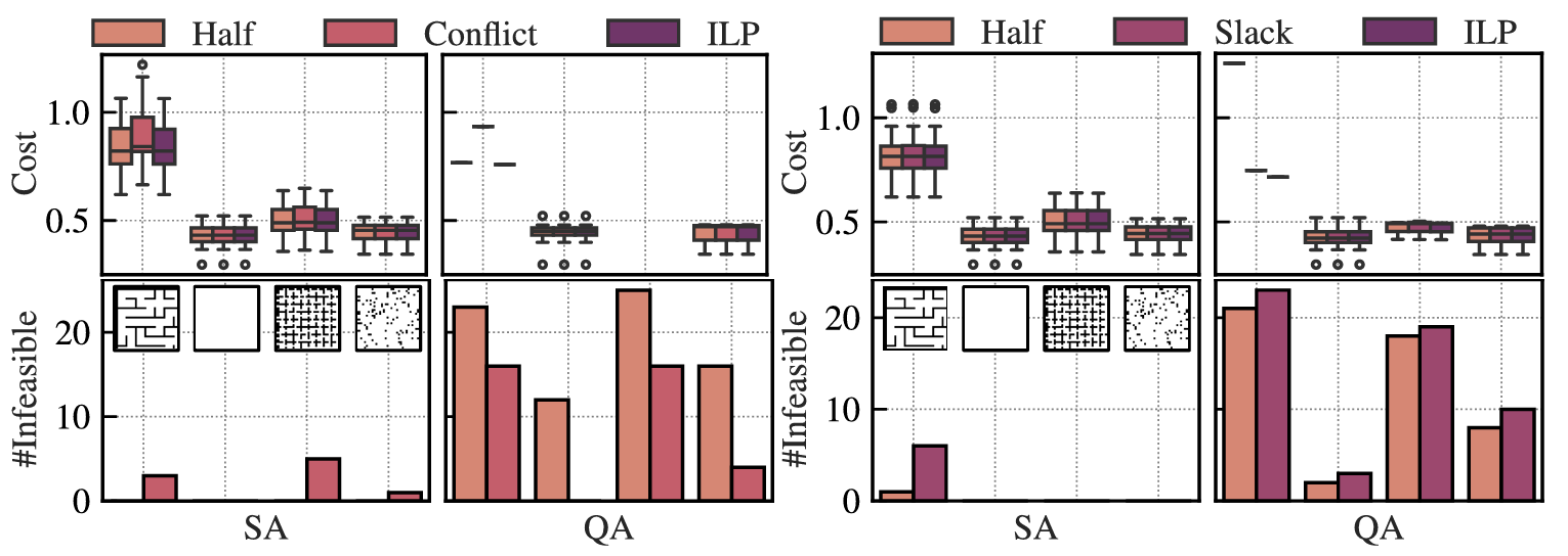 实验采用 D-Wave Advantage 量子退火器(5670 个物理 qubit),通过冲突图分解将 QUBO 问题拆分为小尺寸子问题,有效规避了量子硬件的 qubit 数量和连通性限制。结果显示,基于冲突图的 QUBO formulation(CONFLICT)比其他形式(如 SLACK、HALF)更易获得可行解, infeasible 解数量减少 30% 以上。