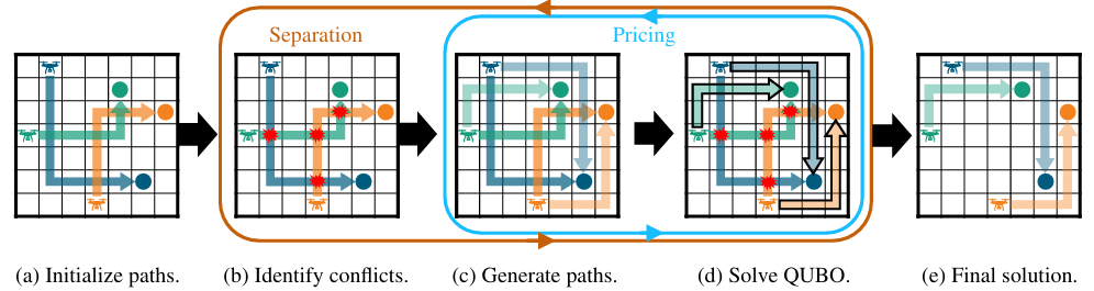 4.量子求解:将当前路径集对应的 QUBO 问题提交给量子退火器或经典模拟量子 solver,得到无冲突的路径组合;
