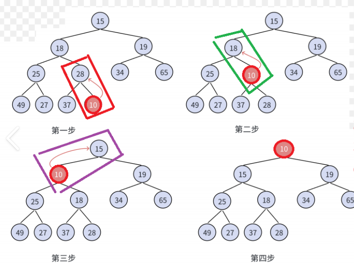 向上调整算法插入的值如果是要建立小堆,那就对新插入的值向上调整,看是否小于上面的值,如果小于,就双方调整位置,直到该值已经是比上一面的父节点要大就结束,若建立大堆区就相反