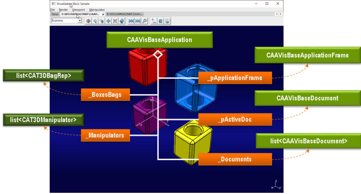 CAAVisBaseApplicationFrame聚合了CGR应用程序文档(CAAVisBaseCGRDocument),其中包含包含CGR模型的CAAVisBaseView 实例类。