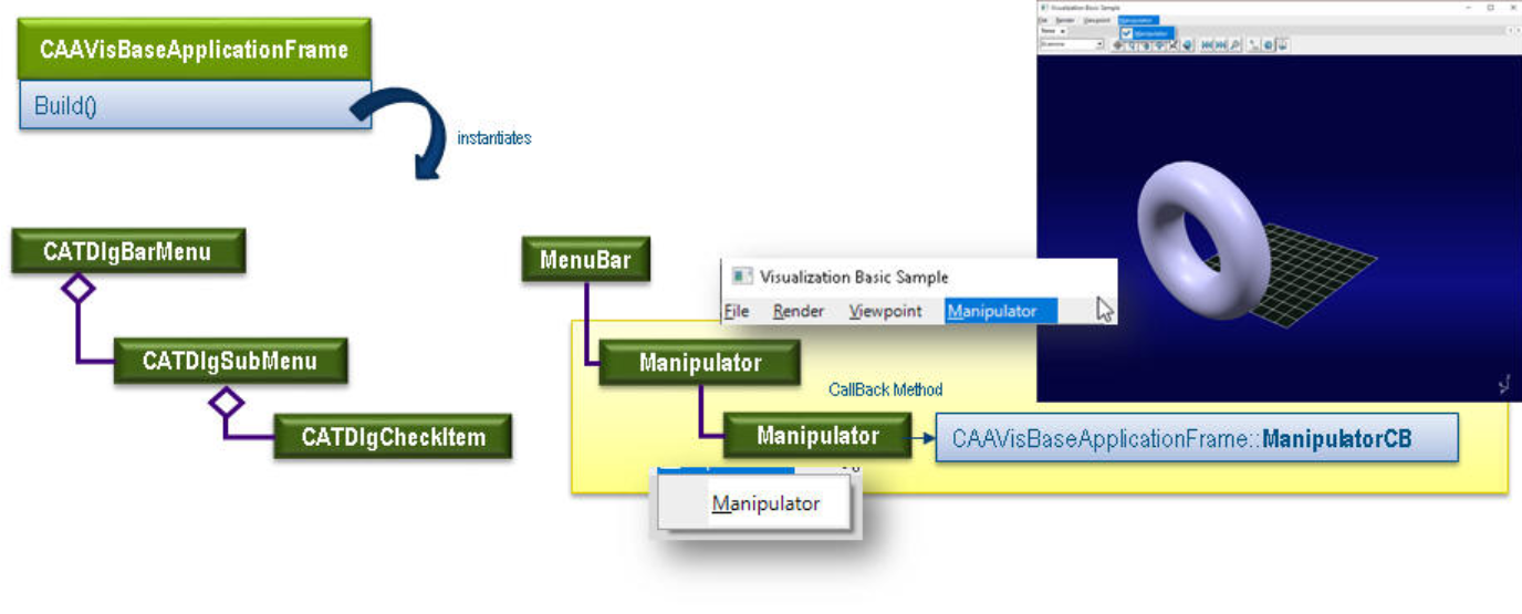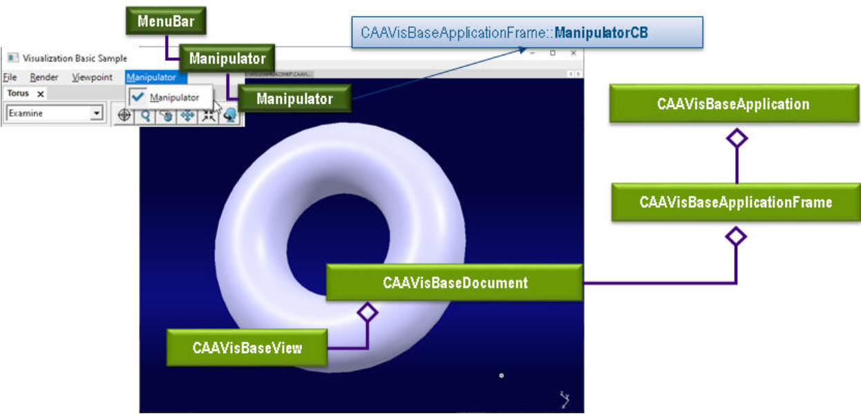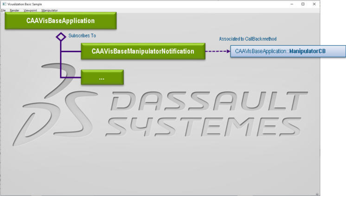 当用户调用回调方法CAAVisBaseApplicationFrame::ManipulatorCB时,CAAVisBaseApplicationFrame类实例化通知CAAVisBaseManipulatorNotification并将其发送给CAAVisBaseApplication类,后者订阅了该通知。