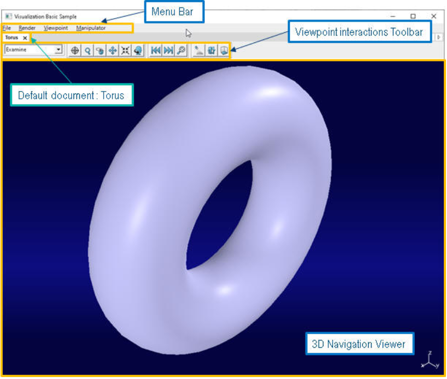 CAAVisBasics包含一个MDI交互式应用程序,在其模型窗口中显示视图。应用程序启动时会显示其中一个视图,其中包含一个圆环面的表达。