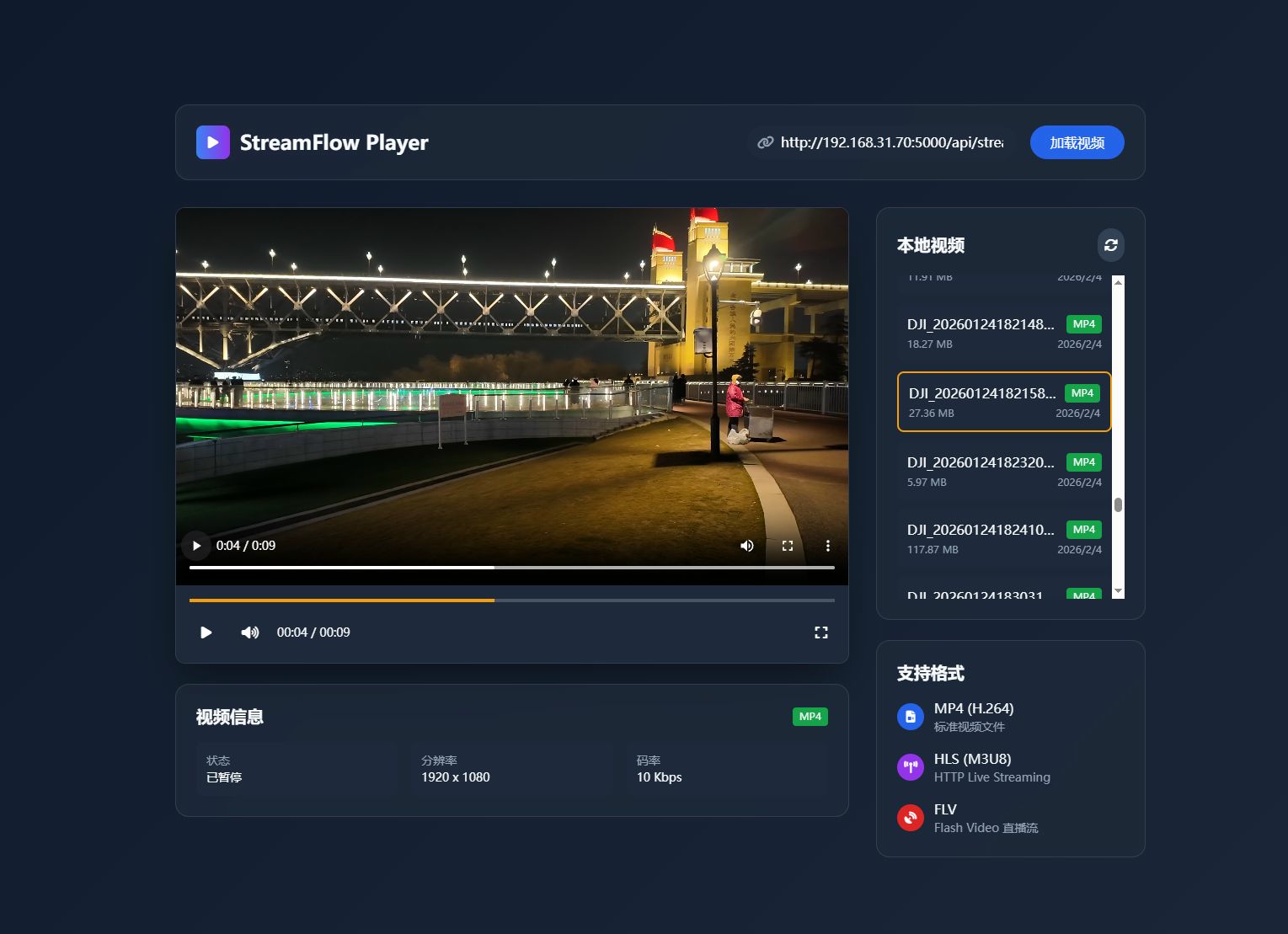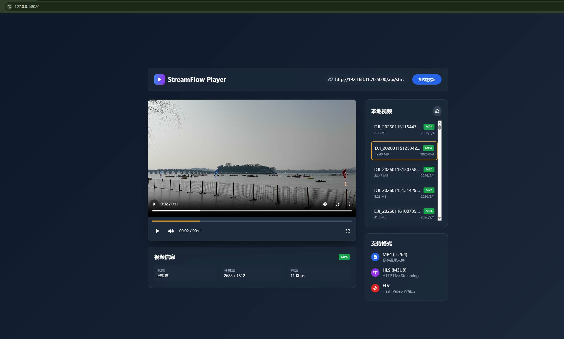 经过2个小时的开发,我创建了StreamFlow Player------一个简洁而实用的网页应用。它的界面设计以深色为主,突出重点内容,整体风格干净利落。