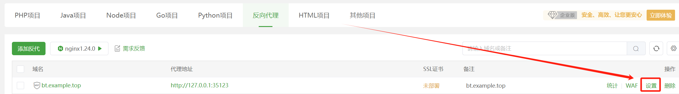 在面板原本的"设置"里,有一个"绑定域名"的选项。既然你用了反向代理,那个地方建议留空,或者填