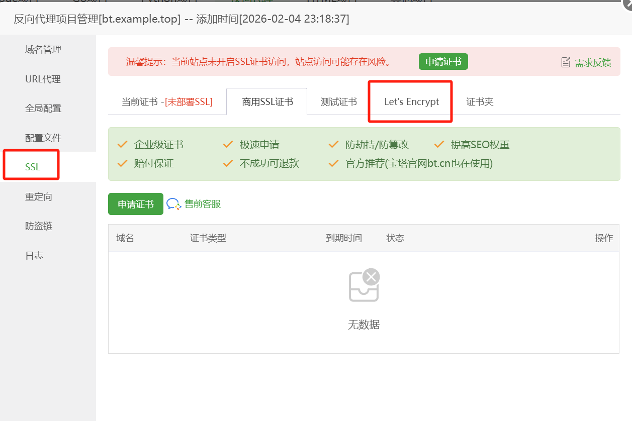 - 在网站列表点击该域名的"设置" -> "SSL" -> "Let's Encrypt" -> 申请并开启"强制 HTTPS"。