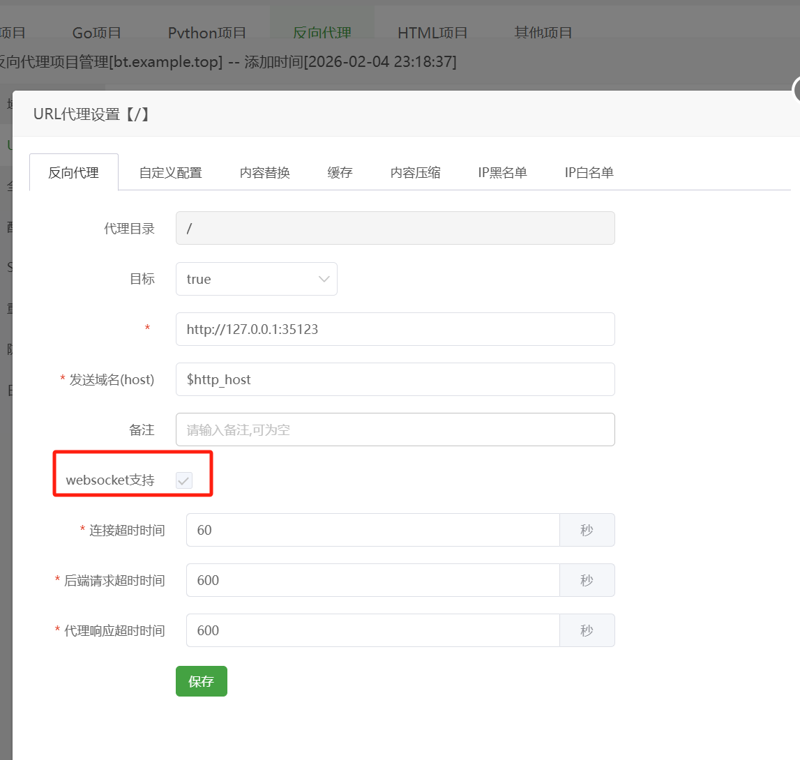 127.0.0.1。 如果你在那里也填了bt.example.top,有时候会造成死循环或鉴权错误,因为面板发现请求来自127.0.0.1(即 Nginx),但你却绑定了公网域名,它可能会拦截。- 如果访问报错"请使用正确的入口",请检查你的安全入口字符串是否正确。