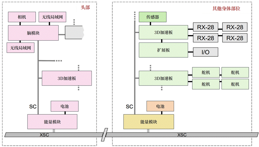 - 基础算力节点(AccelBoard3D):共25个,每个搭载72MHz Cortex-M3 ARM RISC处理器与3轴加速度传感器,最多连接4个执行器(Robotis RX-28型),负责本地传感数据采集(关节角度、电机电流等)、低层级运动控制(如关节力矩调节)等实时性要求高的轻量级任务,实现"传感-计算-控制"本地闭环,减少数据传输延迟。