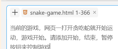 我们发现打开这个代码,蛇就开始移动,往往反应不过来,这个时候我们增加需求:添加开始/暂停按钮来开始和暂停游戏,我们在对话框中输入如下
