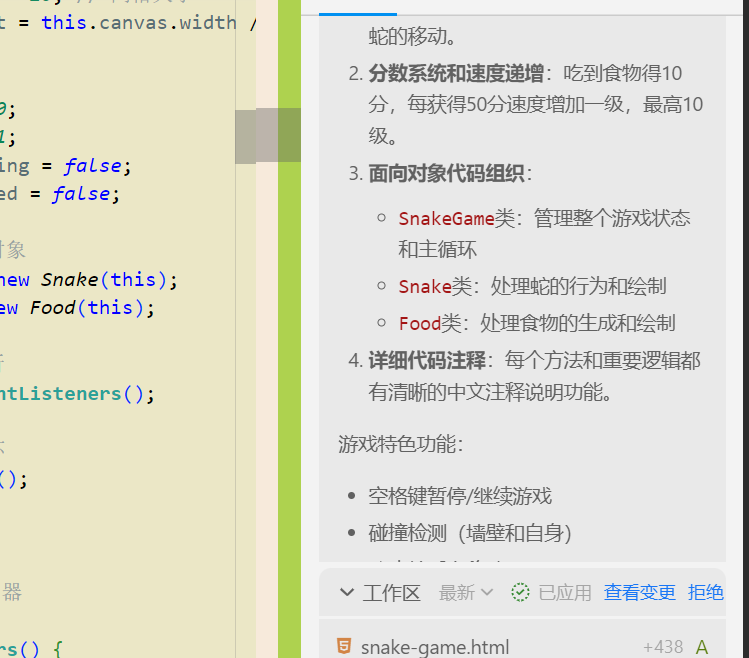 当运行完成后,界面直接进入diff模式查看代码,同时也具有vscode的相应的按钮,来决定是否接受代码