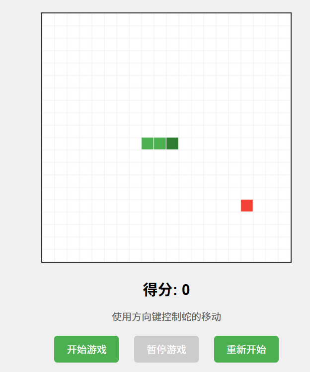 当前的游戏,网页一打开贪吃蛇就开始运动,游戏开始。请添加开始,结束,暂停按钮来控制游戏