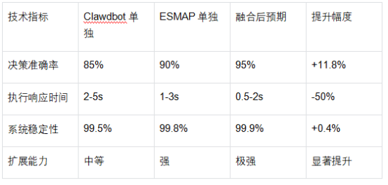 以下通过量化对比的方式,直观展示了 Clawdbot 与 ESMAP 融合后在决策准确率、执行响应时间、系统稳定性和扩展能力四个关键技术指标上的预期提升,为技术融合的效果提供了可量化的评估标准。
