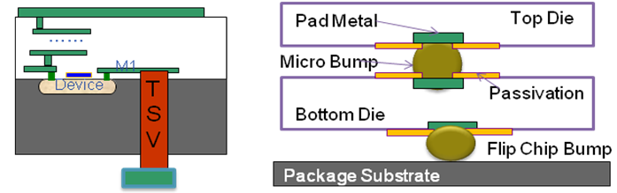 - 当芯片堆叠时,芯片间对齐的Bump构成了芯片间的数据传输路径。