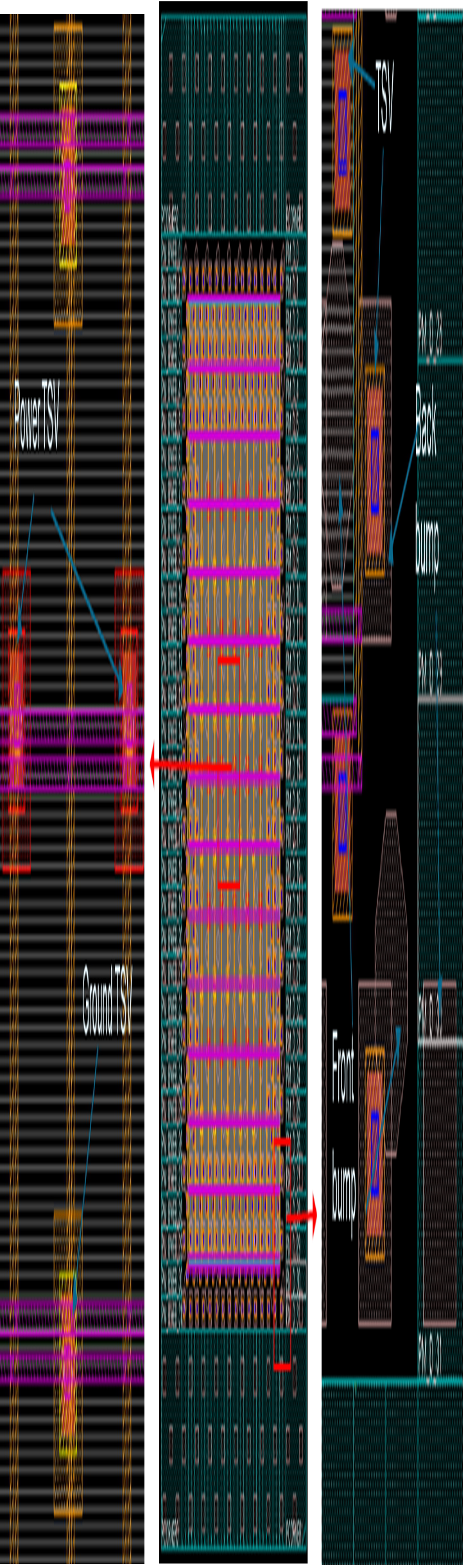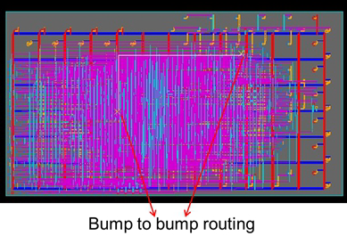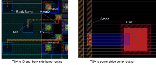正面凸点到 TSV - bump 通孔网络的布线 在某些情况下,TSV 通孔和背面bump 会被封装在一起,形成一个新的bump 单元,称为TSV bump 。TSV bump 通常在正面、TSV 层和背面都有多个几何形状。