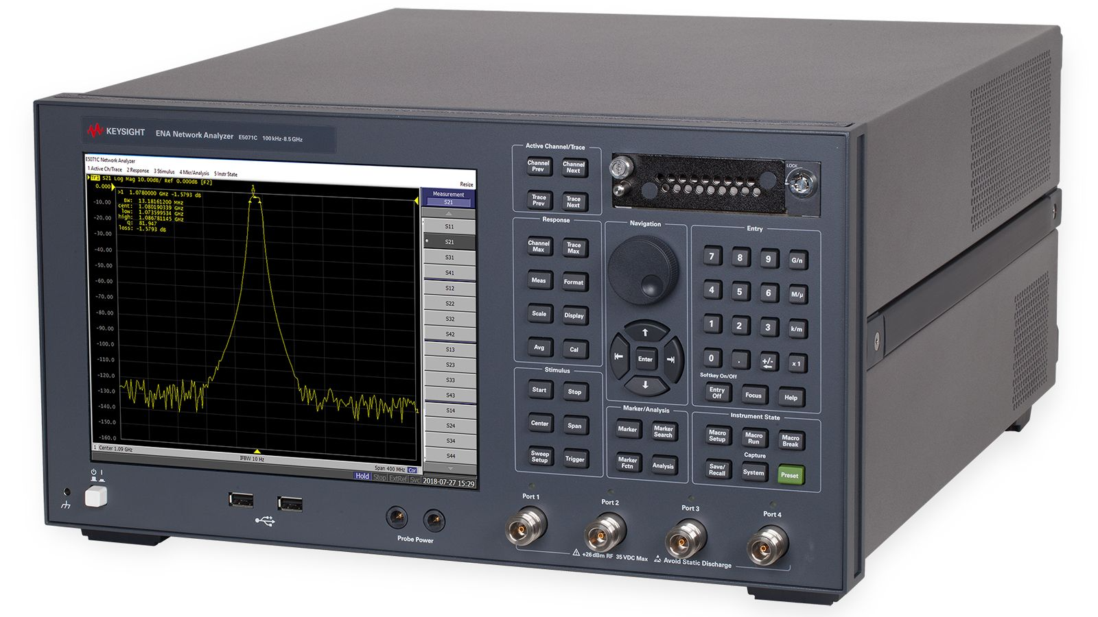 启动VNA测试功能,屏幕将显示S21曲线,需读取全频段内的S21数值:曲线最低点(数值最负)对应最佳隔离度,最高点对应最差隔离度;测试需重点记录全频段内的最差隔离度数值。 - 多端口器件测试拓展
