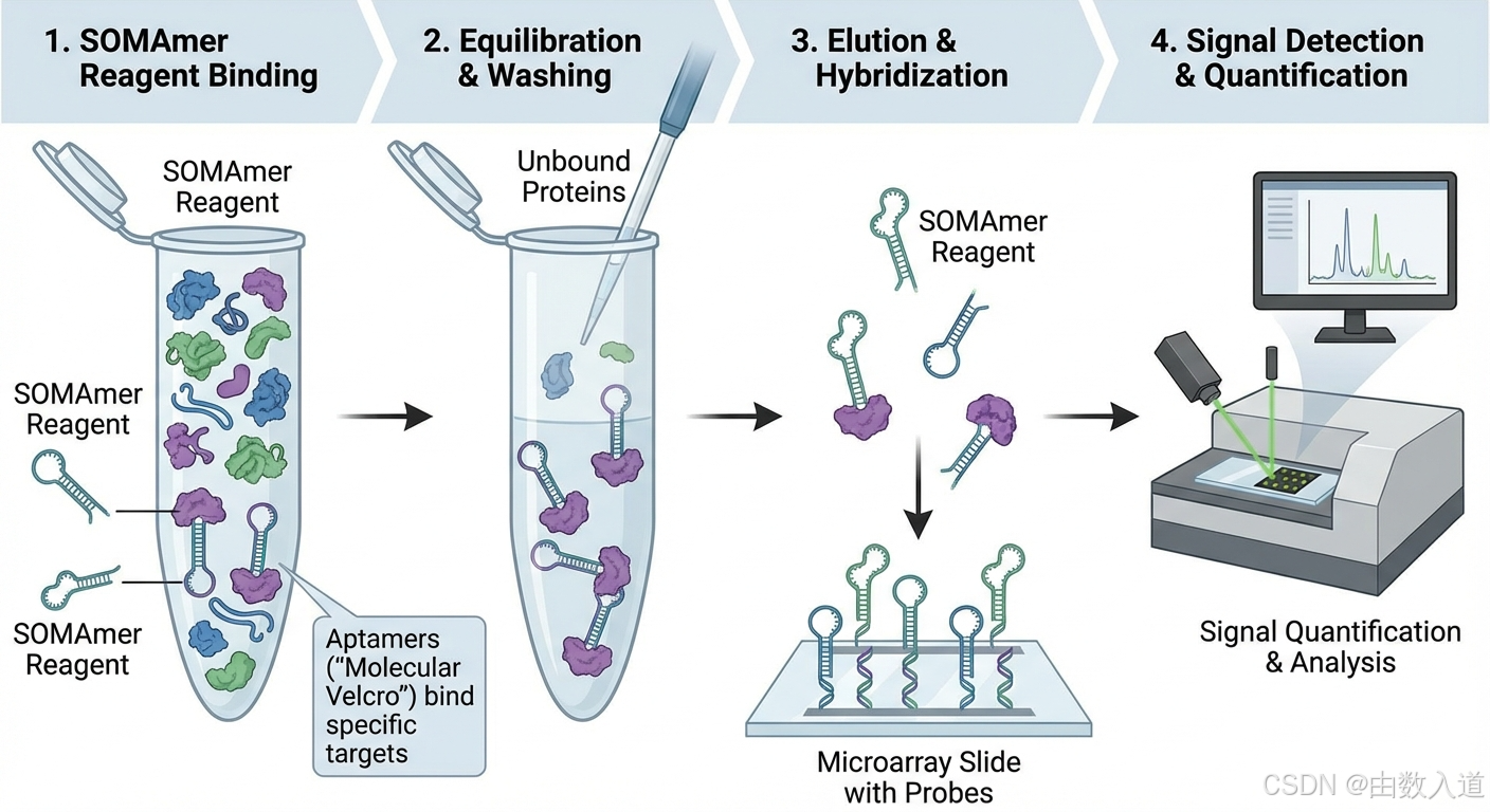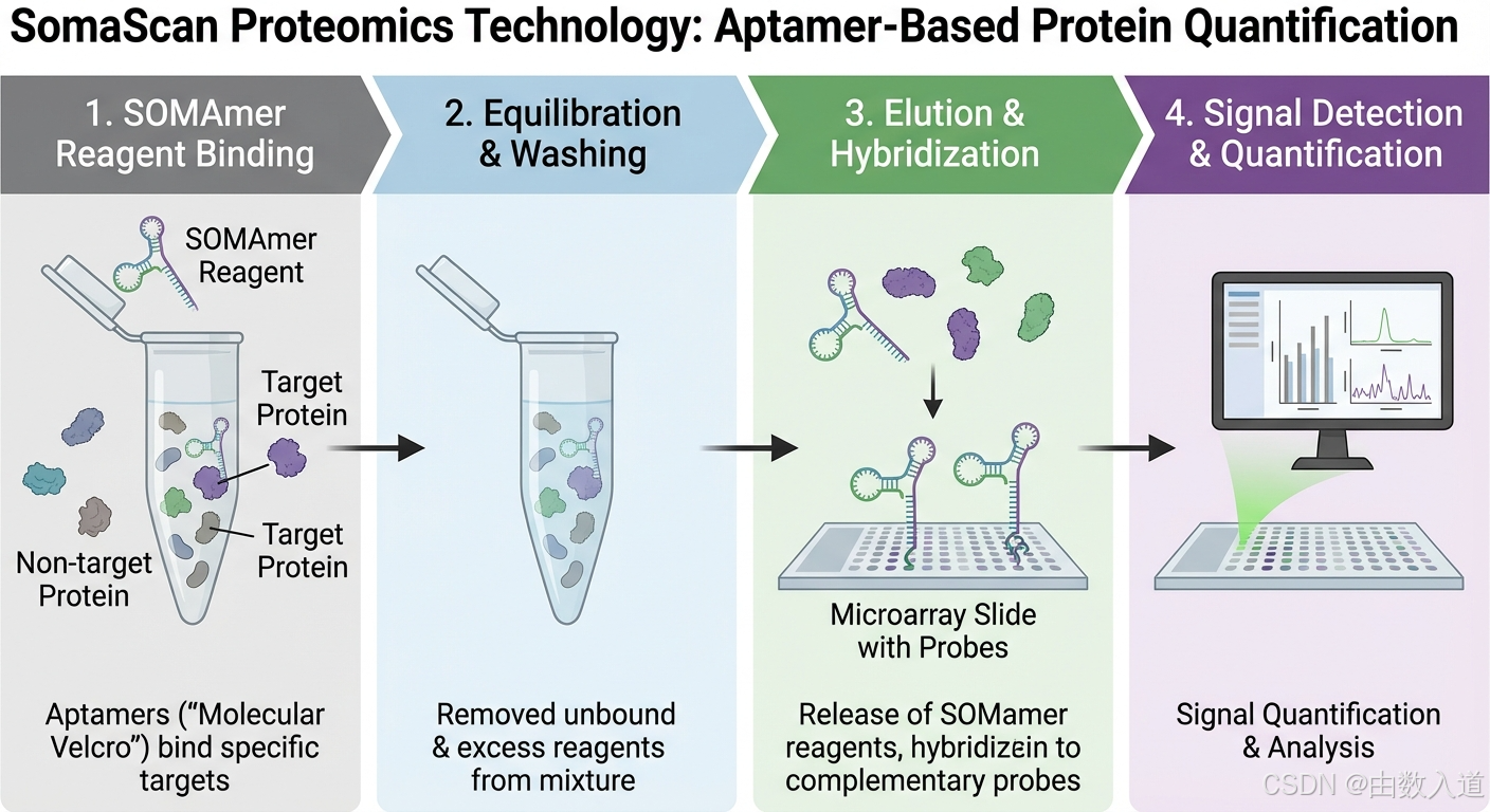 - 核心探针:使用一种叫做SOMAmer(Slow Off-Rate Modified Aptamer)的人工合成DNA分子作为探针。这些SOMAmer经过特殊设计,能够像"分子魔术贴"一样,以极高的特异性和亲和力"粘住"血液中的目标蛋白质。