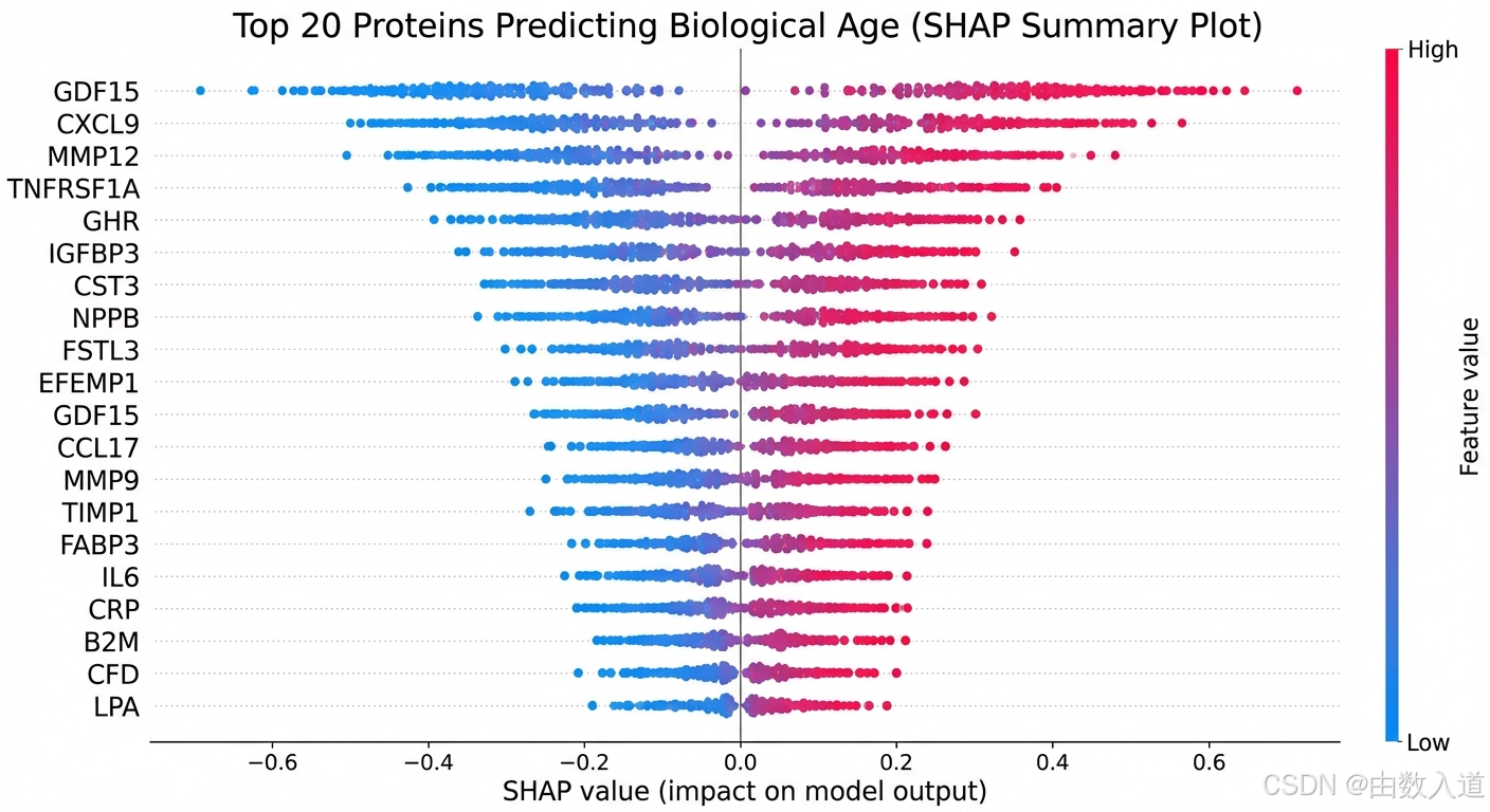 - 全局解释:SHAP可以告诉我们,在整个模型中,哪些蛋白质对预测年龄的贡献最大。我们会得到一个"Top 20衰老相关蛋白"的列表。