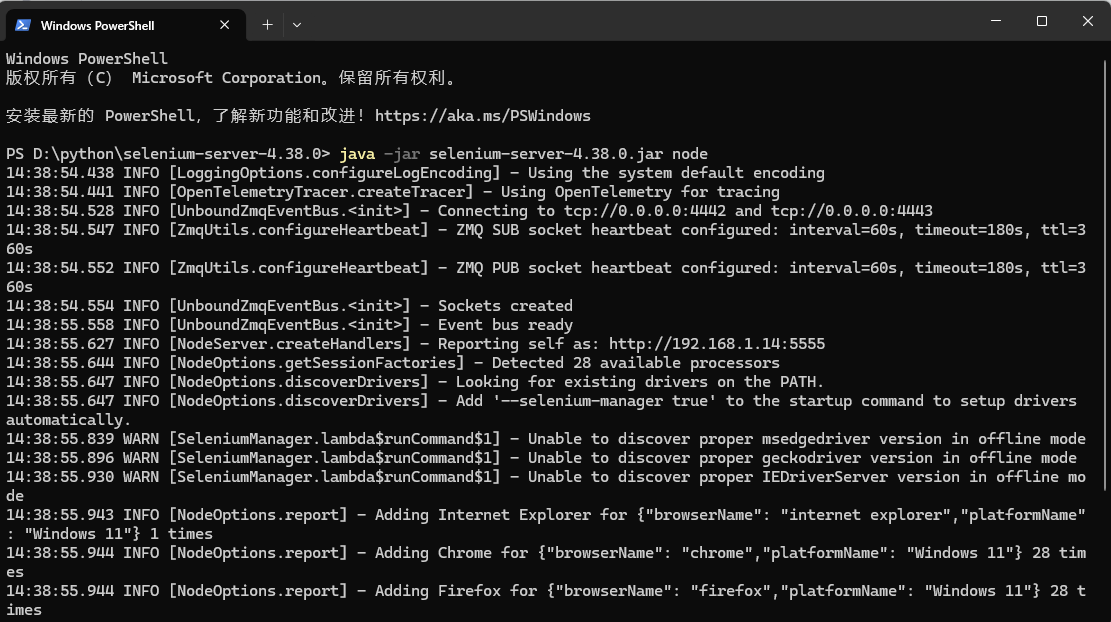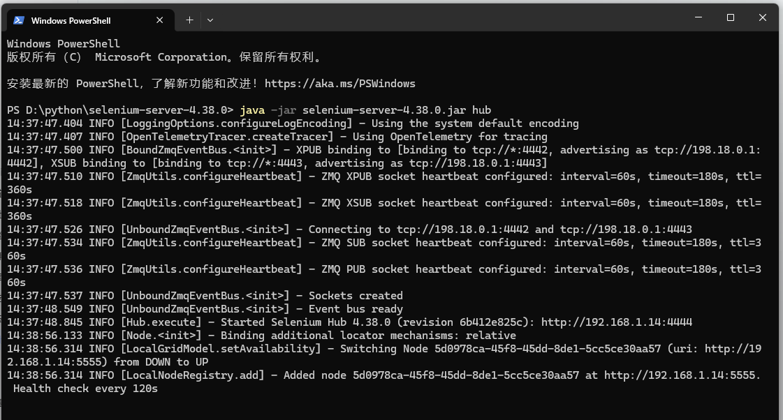 1.3 切换到 jar 包目录后终端运行命令:java -jar selenium-server-4.38.0.jar hub 和 java -jar selenium-server-4.38.0.jar node