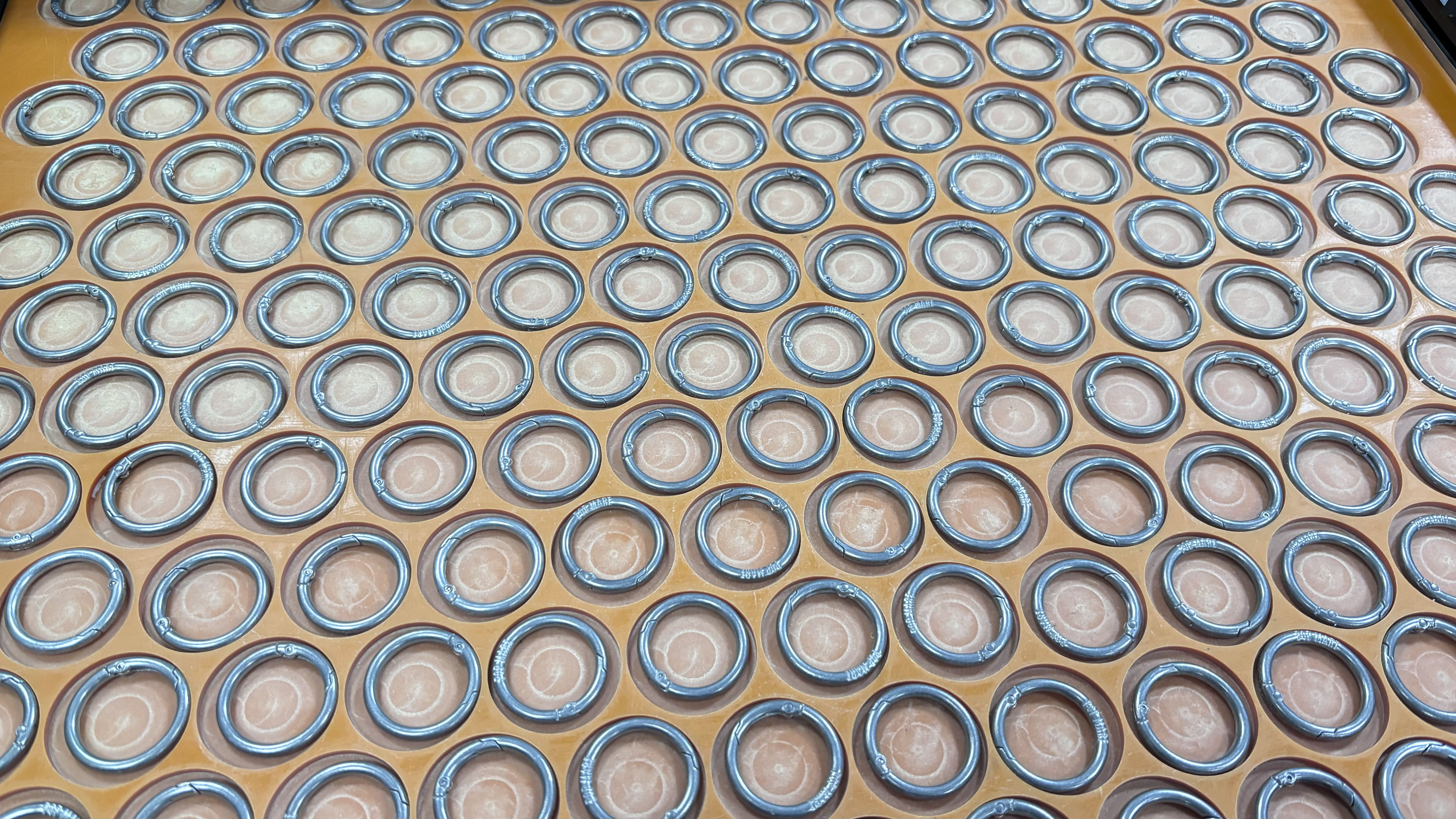 在金属表面处理(如喷涂、电镀)及后续的激光打标、视觉质检等精密工序中,待处理的金属弹簧扣(钥匙扣)必须以高度一致的姿态进行批量化准备。这一前置的摆盘环节,其效率与精度直接影响整体生产流的顺畅性与最终产品的质量一致性。