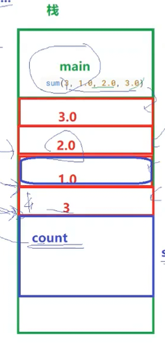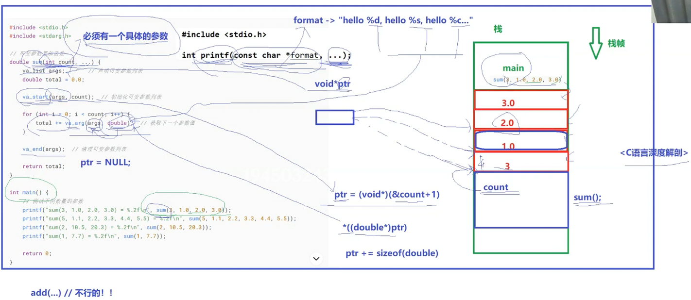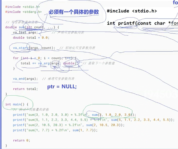 开始我们的ptr指针你可以认为指向空。然后通过ptr=(void*)(&count+1),这样就能指向我们的形参了,所以我们第一个参数一定要是一个确定的形参,不能是函数模板,第一个参数的作用就是让我们能找到我们可变参数模板的形参的。循环中那个函数的作用就是让我们的这些形参都转换为double类型的就是(double)(*ptr)这样的形式,最后一个函数的作用就是让我们的ptr指向NULL的。