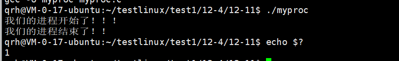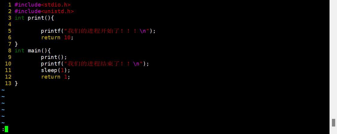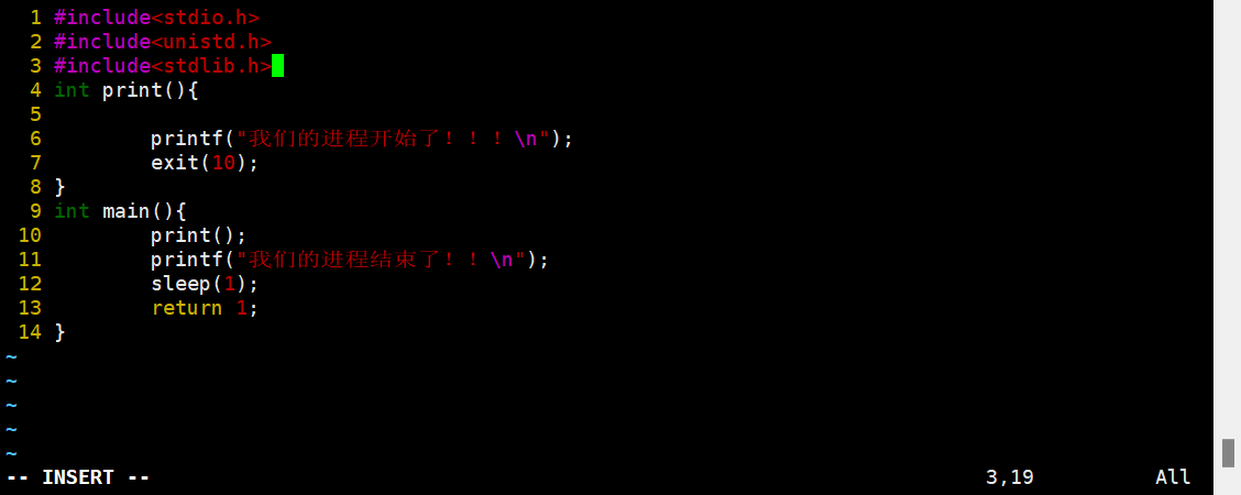 我们发现只运行了一句话,并且返回值是10,这就很清楚区别了,return是在main函数中结束进程的,其他函数中不结束,但是我们的exit则是在这个语句处直接结束进程并且返回。