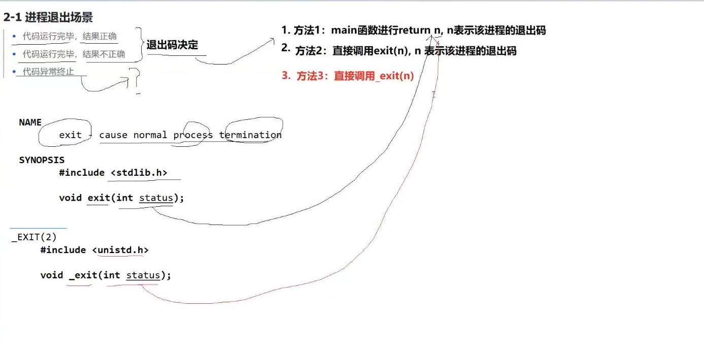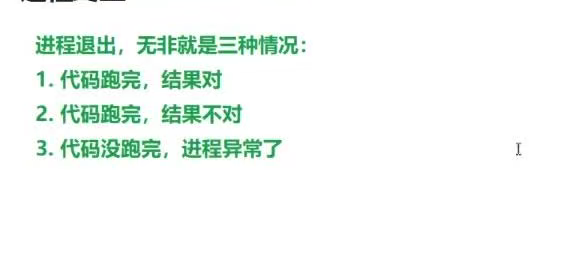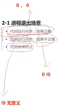 进程终止无非这三种情况,代码跑完了,退出码才是有意义的,通过退出码,我们就可以知道是什么类型的错误了,但是如果代码没跑完崩掉了,退出码此时无意义了,崩掉不就是代码异常了吗,操作系统要知道异常的原因,然后通过相应的信号杀掉进程,这个我们下面再详谈,这里先了解一下。