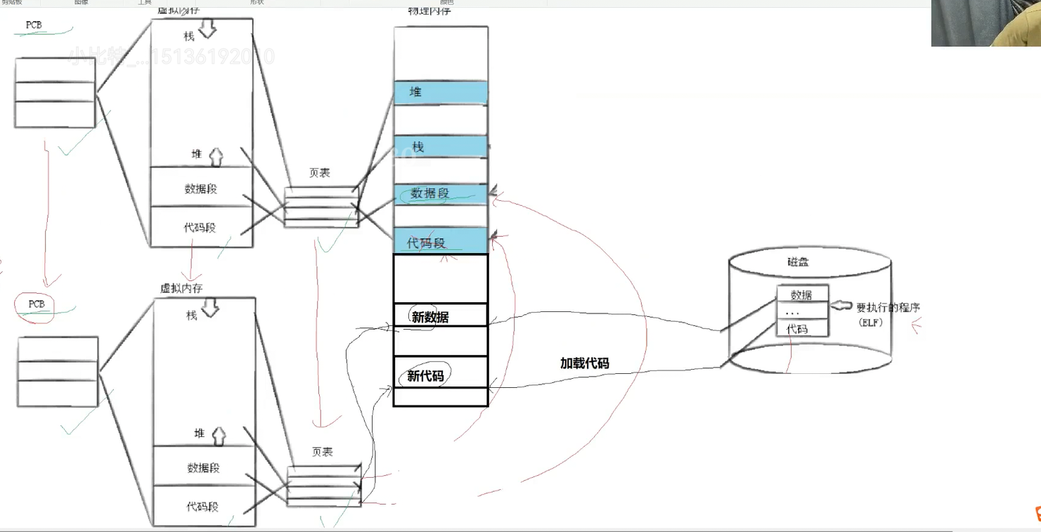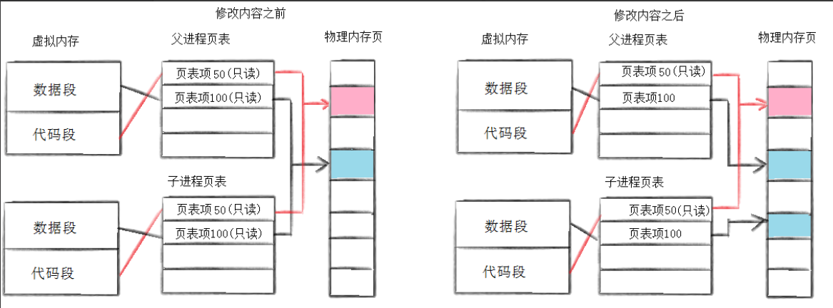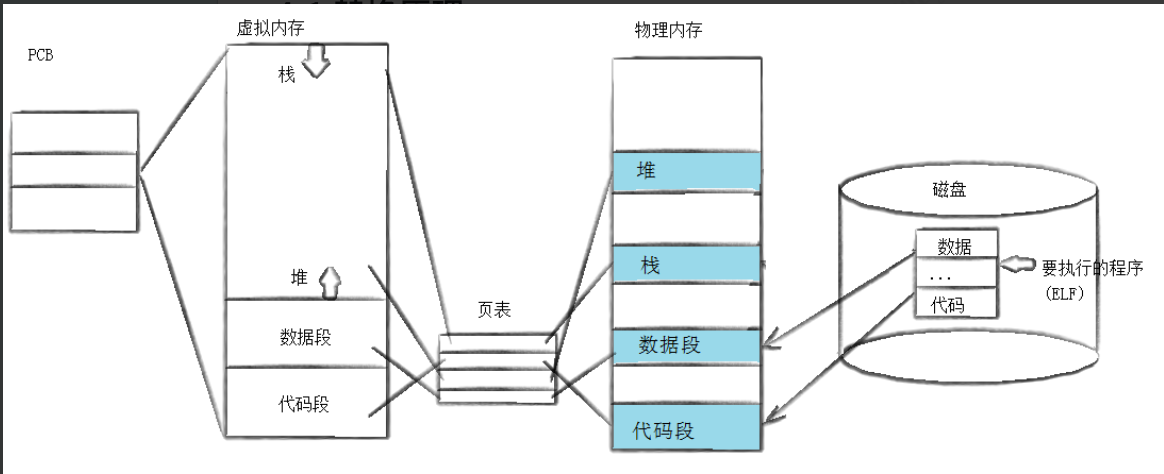 我们看这个图来理解一下,原本我们父子进程共享的都是父进程物理内存中的代码和数据的,但是如果你进行替换的话,此时就会从磁盘中把这个文件的内容加载到内存当中,然后此时你的子进程的页表就会指向新的代码和数据段了。