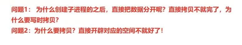第一个问题就是父进程如果由1MB的数据呢,此时你子进程不一定要修改所有的数据啊,有可能值修改了一点,如果我们直接把数据分开,那么内存不是浪费了吗,如果父进程时100MB呢,你直接分开,那么你不就浪费了内存的资源,而且时间成本也增加了。