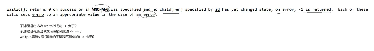 这个主要就要关注两点即可,一点就是这个waitpid的第三个参数,WNOHANG表示的是我们的非阻塞调用,还要就是三个不同的返回值。