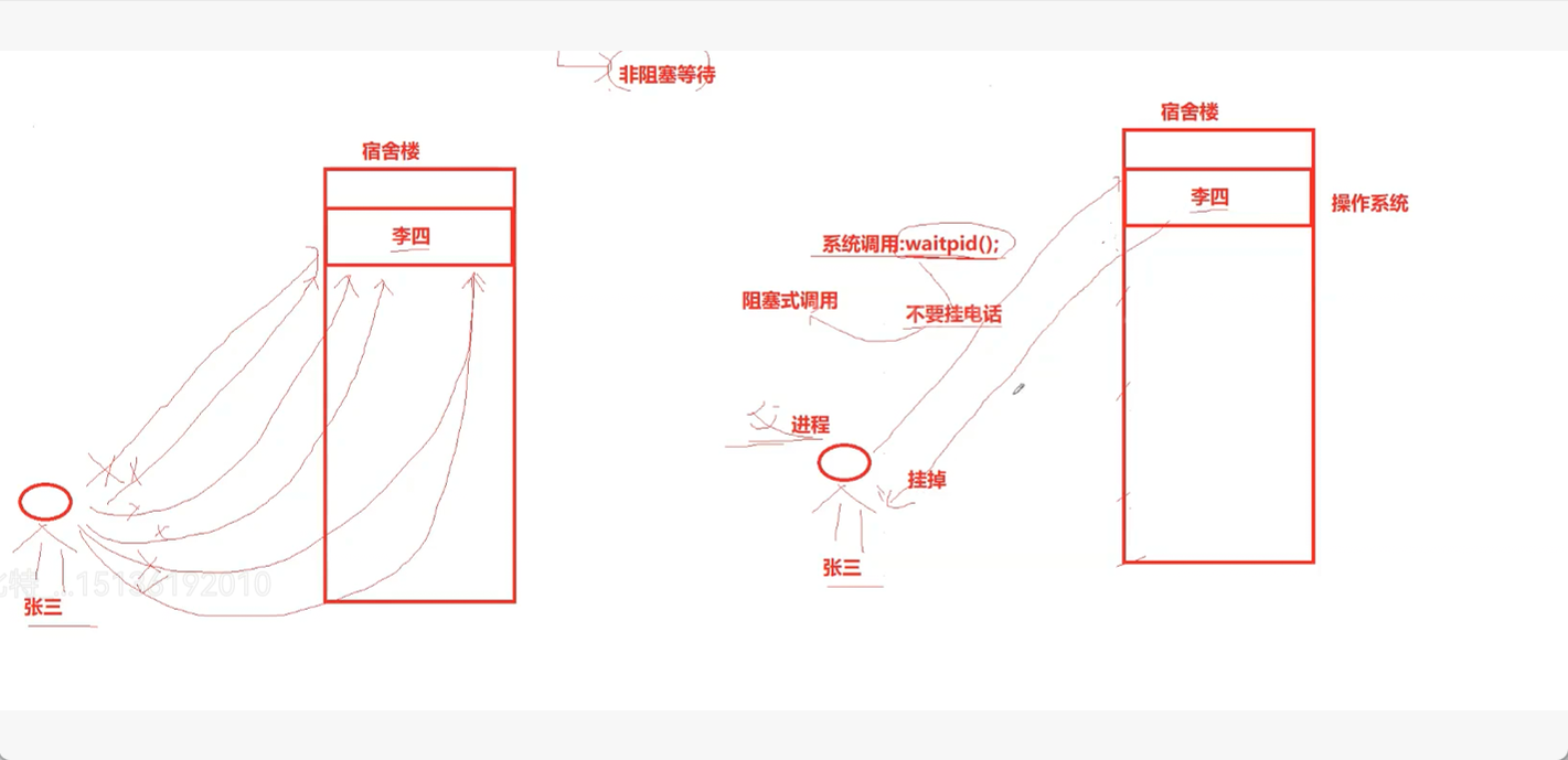 我们来看一下左边是非阻塞调用,就是不断的调用来判断进程是否结束,举个例子吧,就是你去找你朋友玩,你朋友说让你等十分钟,然后你打一次电话,你朋友说马上,你等了一分钟又打了一次,还说马上,你就一直打,一直催直到下来,阻塞调用就是你打个电话不挂断,直到你朋友下来,就是非阻塞就是你可以理解为父进程一直问操作系统结束没,问一次得到一个答案走了,问一次得到一个答案走了,而阻塞就是只在结束的时候直接就来了,中间不过多询问,可以简单这么理解,非阻塞调用就是调用多次waitpid来看子进程的退出状态,而阻塞调用则是只需要调用一次waitpid即可。